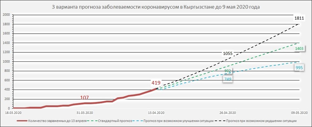 При сохранении нынешних темпов развития распространения коронавирусной инфекции в республике, на 9 мая 2020 года количество зараженных может составить приблизительно 1403 человека;
