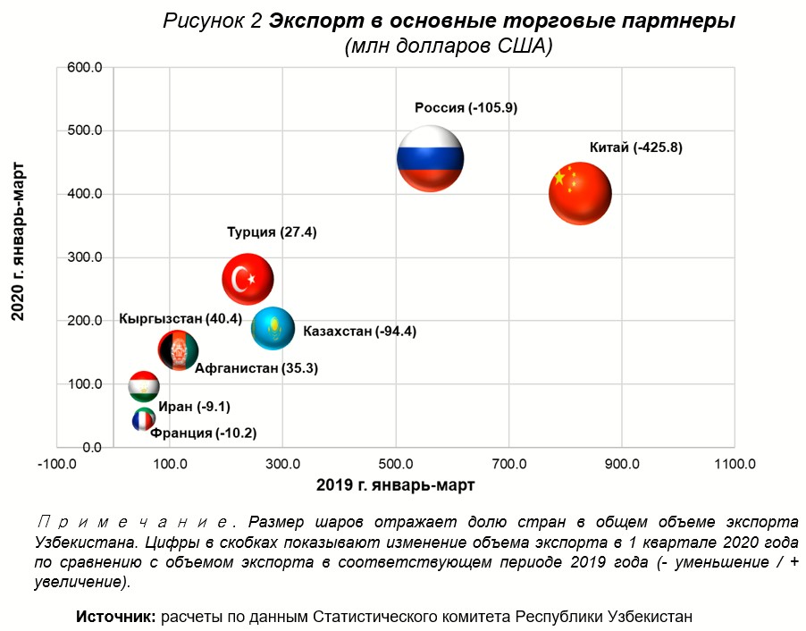Кроме того, благодаря антикоронавирусным мерам спрос со стороны Китая на товары и услуги, производимые в Узбекистане, значительно снизился. В то же время снизился спрос на узбекскую продукцию на рынках других наших основных торговых партнеров, связанных с Китаем через глобальную цепочку добавленной стоимости. Поскольку эпидемия коронавируса превратилась в пандемию и границы закрылись, его сфера влияния еще больше расширились. В результате в январе-марте 2020 года экспорт Узбекистана в Китай сократился на 426 млн долларов по сравнению с аналогичным периодом 2019 года, в Россию - на 106 млн долларов, в Казахстан - на 94,4 млн долларов (Рисунок 2).