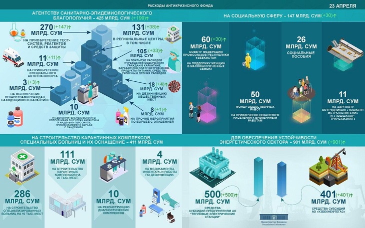 Строительство карантинных комплексов, специальных больниц и их оснащение обошлось в 411 млрд. сумов. Причем значительную долю выделенных средств -286 млрд. поглотило сооружение специальных больниц на 10 тысяч мест.