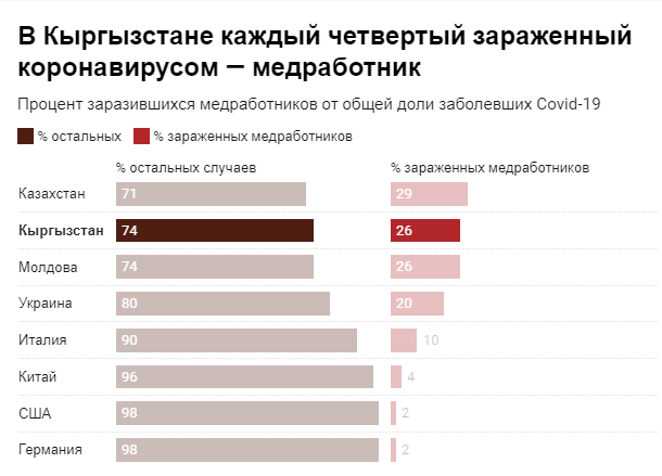 Генеральный директор ВОЗ Тедрос Адханом Гебрейесус назвал «тревожной тенденцией» то, что в некоторых странах заражены до 10% медработников. В Кыргызстане эта доля составляет 26%.