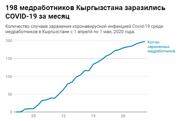 Согласно информации Центра электронного здравоохранения, на 1 апреля 2020 года в Кыргызстане насчитывалось 72 284 медработника. Значит, интенсивный показатель зараженных медработников равен 0,27%.