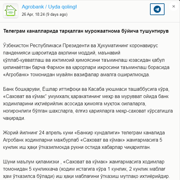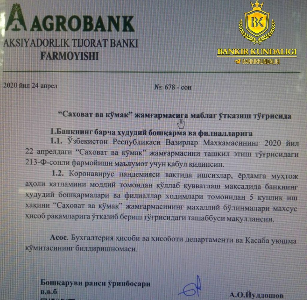 В Telegram канале “Будни банкира” распространилась фотография распоряжения за подписью заместителя председателя правления акционерного коммерческого банка “Агробанк” за №678 от 24 апреля, адресованное всем региональным филиалам учреждения. В документе головной офис банка требует удержать с сотрудников филиалов банка пятидневную заработную плату и перевести их в фонд «Доброта и поддержка»: