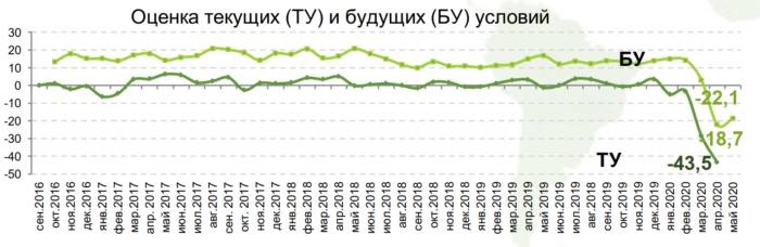 Однако от мая бизнес ждет пусть небольших, но все же улучшений. Оценка текущих бизнес-условий в апреле составила минус 43,5. Майский прогноз — минус 18,7. Для сравнения: прогноз на апрель был ниже 20 пунктов.