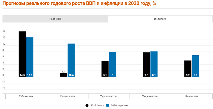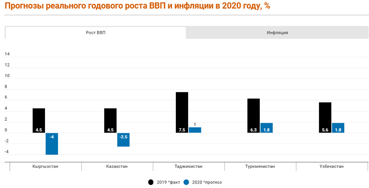 Самое большое падение ВВП ожидает Кыргызстан: минус 4 процента. В то же время Минэкономики страны прогнозирует падение на уровне 7%. Самая высокая инфляция также прогнозируется в Кыргызстане, умеренная – в Казахстане, ниже уровня прошлого года – в Узбекистане.
