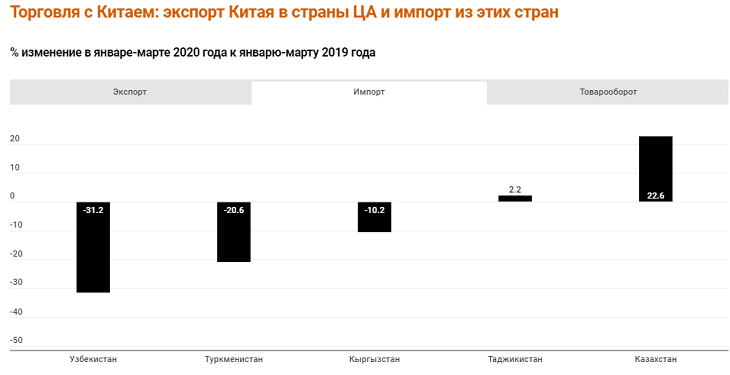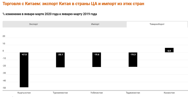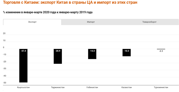 Во всех странах экспорт из Китая сократился за три месяца пандемии. Больше всего сократился экспорт Китая в Кыргызстан – почти вполовину. На треть сократился импорт Китая из Узбекистана, а из Казахстана, напротив, увеличился.