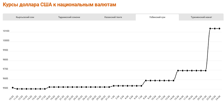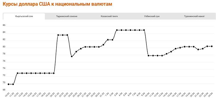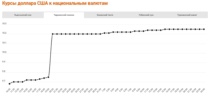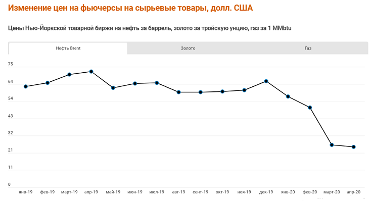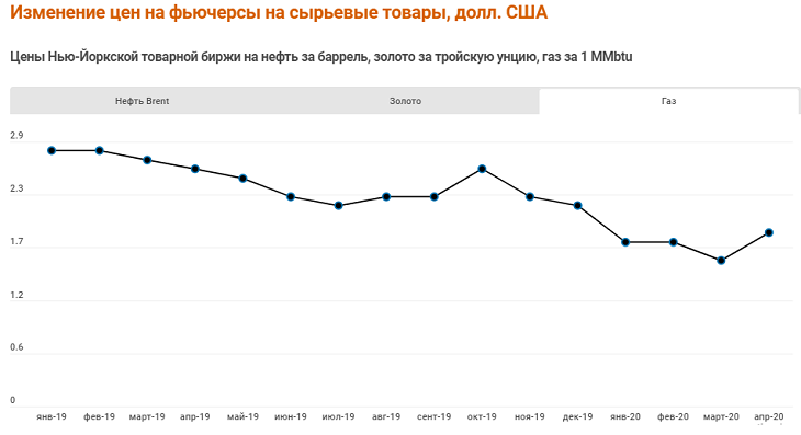 Падение цен на нефть и газ началось в ноябре-декабре 2019 года, усугубившись с пандемией коронавируса. В апреле цена на газ стала расти, цена на нефть продолжает падать. Цены на золото выросли за год больше чем на треть, что выгодно Кыргызстану и Узбекистану.