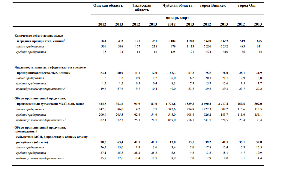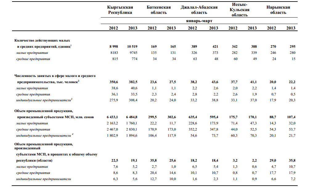 Объем промышленной продукции, произведенный субъектами малого и среднего бизнеса в первом полугодии 2013 года в КР составил 6 млрд 484,8 млн сомов, в 2012 году 6 млрд 433,1 тыс. сомов. При этом больше всего было произведено средними предприятиями - 2 млрд 830,1 млн сомов в первом полугодии 2013 года, в 2012 году - 2 млрд 467 млн сомов.Всего в малом и среднем бизнесе занято 382,5 тыс. человек по данным за первое полугодие 2013 года, в 2012 году — 350,6 тыс. человек.Количество малых и средних предприятий по республике в первом полугодии 2013 года составило 10519, из них 9745 — малые предприятия. В первом полугодии 2012 году количество предприятий 8998, из них 8183 - малые предприятия.
