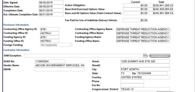 Так, в 2015 году DTRA подписало контракт с компанией AECOM на строительство Центральной референтной лаборатории на базе Казахского научного центра карантинных и зоонозных инфекций им. М. Айкимбаева под Алма-Атой. Сумма контракта — $ 240 млн.