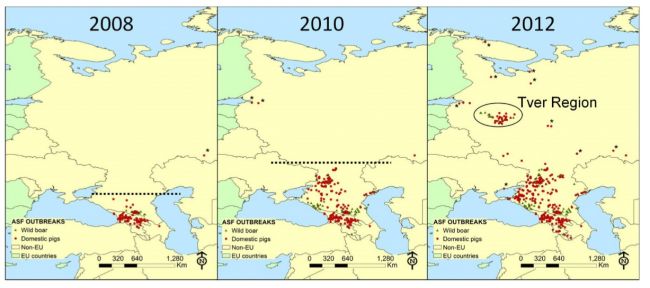 Иллюстрация: «Африканская чума свиней (АЧС): пять лет в Европе». Вет. Микробиол. 2013 г.