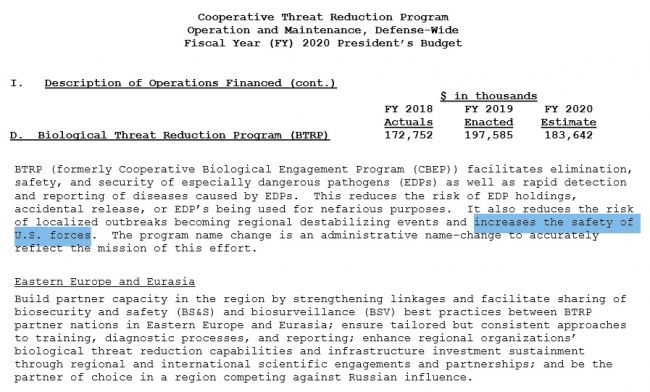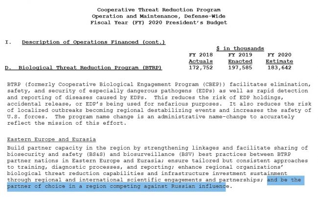 Официально программа Пентагона по снижению биологических угроз (CBEP) нацелена на то, что страны, участвующие в проекте, смогут безопасно хранить особо опасные патогены, быстро определять и сообщать об инфекциях, которые породили на их территории особо опасные вирусы. Одно это на границе с Россией уже имеет стратегическое значение для США, которые не исключают никаких вариантов развития событий. «Программа (CBEP) также снижает риск локальных вспышек, которые могут дестабилизировать региональную обстановку, и увеличивает безопасность американских войск», — говоритcя в проекте бюджета DTRA на 2020 год по программе CBEP в странах бывшего СССР.