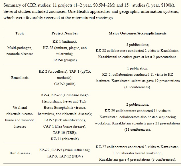 Как говорится в научной работе казахских и американских ученых об истории совместных биологических исследований, с 2005 года в Казахстане осуществили более 25 проектов. Изучали опасные патогены и вирусы, которые становятся причиной, например, сибирской язвы, чумы, туляремии, энцефалита, геморрагической лихорадки Крым-Конго и коронавирусных инфекций. На эти исследования американское военное агентство выделило $ 20 млн.