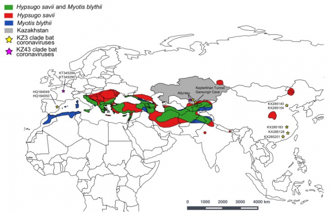 Так, например, при изучении новых коронавирусов летучих мышей в Казахстане специалисты выяснили, что между Европой и Азией может происходить циркуляция коронавирусов за счет миграции летучих мышей. В двух пещерах и туннеле обнаружили несколько штаммов, генетически сходных с MERS-коронавирусом, SARS-коронавирусом и человеческими коронавирусами 229E и NL63. И определили две различные линии коронавирусов летучих мышей в Казахстане. «Обе они тесно связаны с коронавирусами летучих мышей из Китая, Франции, Испании и Южной Африки, что позволяет предположить, что циркуляция коронавирусов распространена у нескольких видов летучих мышей с перекрывающимися географическими распределениями», — говорится в исследовании.