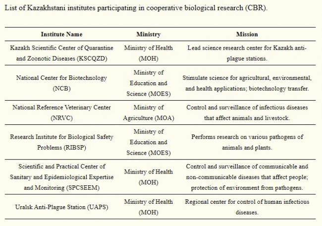 Биолаборатории Казахстана используются в Программе снижения биологической угрозы Минобороны США (BTRP). В ней участвует шесть казахских учреждений, в развитие лабораторий и подготовку персонала которых DTRA и вкладывало средства. Речь идет о Казахском научном центре карантинных и зоонотических заболеваний, в который входят противочумные станции, Национальном центре биотехнологии, Национальном референтном ветеринарном центре, Научно-исследовательском институте проблем биологической безопасности, Центре санитарно-эпидемиологической экспертизы и мониторинга и Уральской противочумной станции. Все они подчиняются различным министерствам Казахстана.