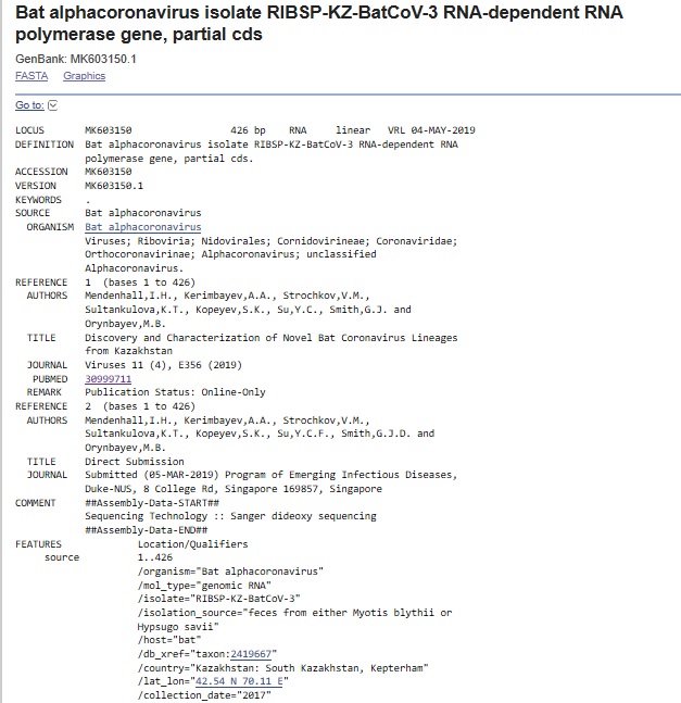 Так, в 2017 году на средства DTRA в Казахстане осуществляли проект KZ-33 по обнаружению новых коронавирусов летучих мышей. В пещерах Унгирли, Карангир и тоннеле Кептерхан в Туркестанской области на юге страны специалисты собрали 200 образцов помета и открыли 12 новых коронавирусов. В исследованиях участвовали Научно-исследовательский институт проблем биологической безопасности Казахстана и совместная американо-сингапурская медицинская школа Duke-NUS, которая является давним подрядчиком DTRA по проведению различных биоисследований. Несмотря на то, что именно казахские специалисты проводили полевые работы и эксперименты, 8 изолятов коронавирусов оказались в медицинской школе Duke-NUS в Сингапуре.