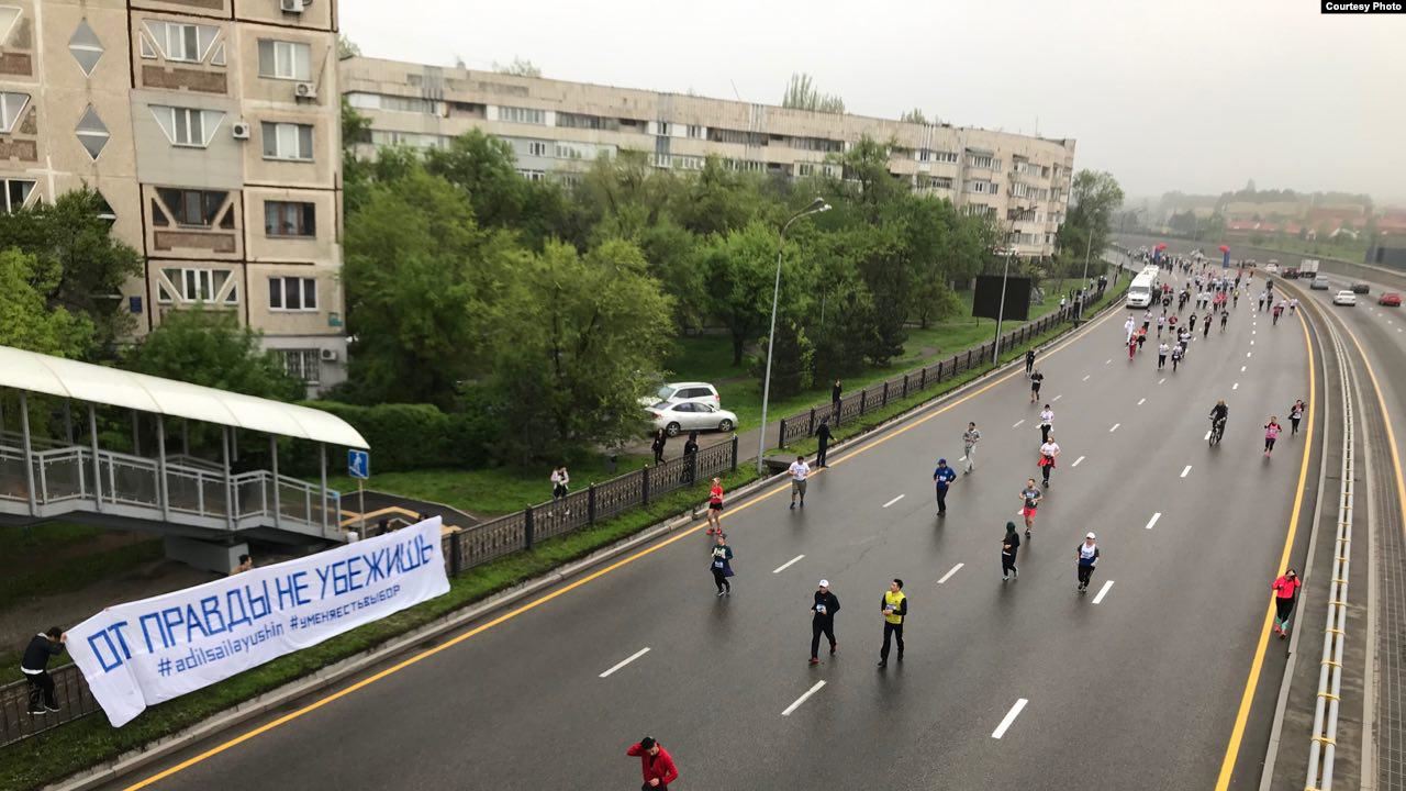 Надпись: «От правды не убежишь» — на баннере вдоль трассы марафона. Алматы, 21 апреля 2019 года.