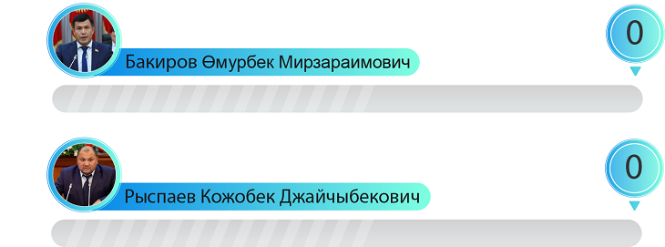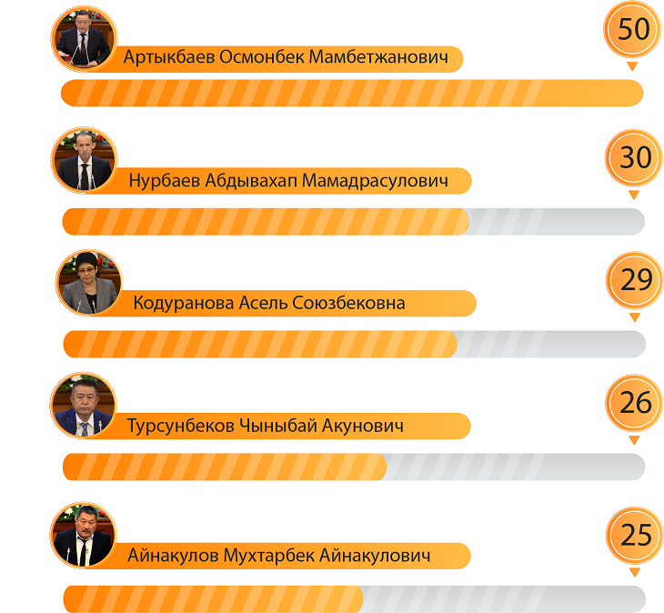 Самым активным депутатом был Дастан Бекешев – 75 инициатив, а самым молчаливым оказался Омурбек Бакиров – за четыре года он не представил ни одной инициативы, однако за этим депутатом не числятся прогулы.