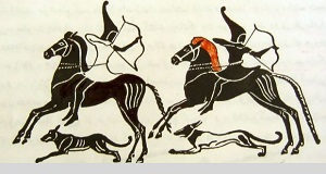 Изображения скифских воинов на сосуде из электрума IV века до нашей эры. Он был найден в кургане Куль Оба близ Керчи.
