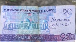 В последнее время в Туркменистане стали попадаться денежные банкноты различного достоинства с антиправительственными призывами, написанными от руки. Об этом сообщает независимый сайт Turkmen.news, со ссылкой на собственные источники. «Протестные» надписи на туркменском языке «Haramdag, güm bol!» («харам» на туркменском означает «недозволенное, запретное, не имеющее права быть среди приличных вещей» - созвучно с «Аркадаг» - официальным титулом президента Гурбангулы Бердымухамедова), что можно интерпретировать как «Ненавистный, пошел вон!», и «Haramdaga Olum, Halk oyandy!» («Смерть Харамдагу, народ проснулся!») красуются на ряде банкнот, которые попадают людям в виде сдачи в такси, торговых точках и даже банкоматах. Разумеется, от таких «опасных» денег граждане предпочитают как можно быстрее избавиться, стараясь незаметно подсунуть их при первой возможности кому-нибудь другому.