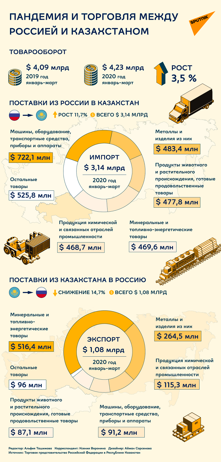 Российские поставки выросли на 11,7% (до 3,2 миллиарда долларов США), ввоз из Казахстана уменьшился на 14,7% (до 1,1 миллиарда долларов США).