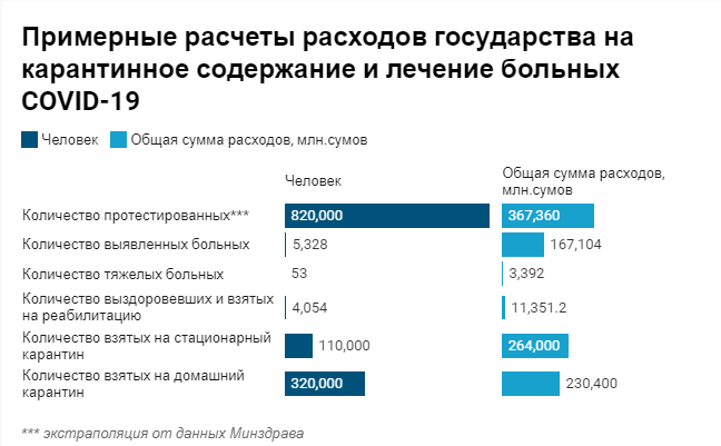 Оторвемся от этих цифр ненадолго и вернемся к интервью министра здравоохранения Узбекистана Алишера Шадманова от 23 апреля 2020, где он раскрыл основные статьи расходов на лечение одного пациента с коронавирусом и отметил, что «Минздрав никогда не работал так свободно с точки зрения финансирования. Нам выделено 5,4 трлн сумов, включая 3,9 трлн сумов — из бюджета, 1,2 трлн сумов — из Антикризисного фонда. Еще мы освоили 32 млн долларов средств международных финансовых средств. Кроме того, составлены договора на 150 млн долларов на покупку оборудования».