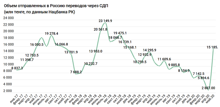 В Казахстан денег приходит значительно меньше. В апреле объем переводов через СДП составил 12,5 млрд тенге, в мае – чуть менее 20,5 млрд, то есть восстановление этого показателя происходит гораздо медленнее.
