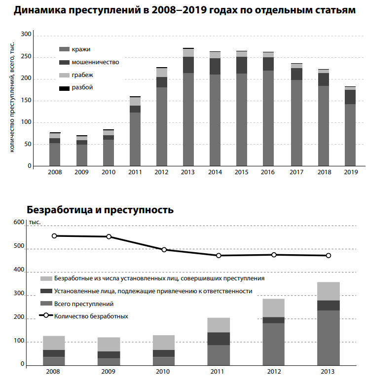 Маловероятно, что кризисные явления в экономике могли привести к трехкратному росту преступности в период с 2010 по 2013 год (с 131 тыс. до 359 тыс. в год), а вот принципиальные изменения в обязательном учете и регистрации преступлений – вполне. Тем не менее даже с учетом некорректных официальных данных можно найти некоторые закономерности, связывающие преступность с кризисной экономикой.