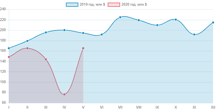 Всего за пять месяцев 2020-го в республику перечислили $699,32 миллиона. Это на $237,06 миллиона, или на четверть меньше, чем за аналогичный период 2019-го.