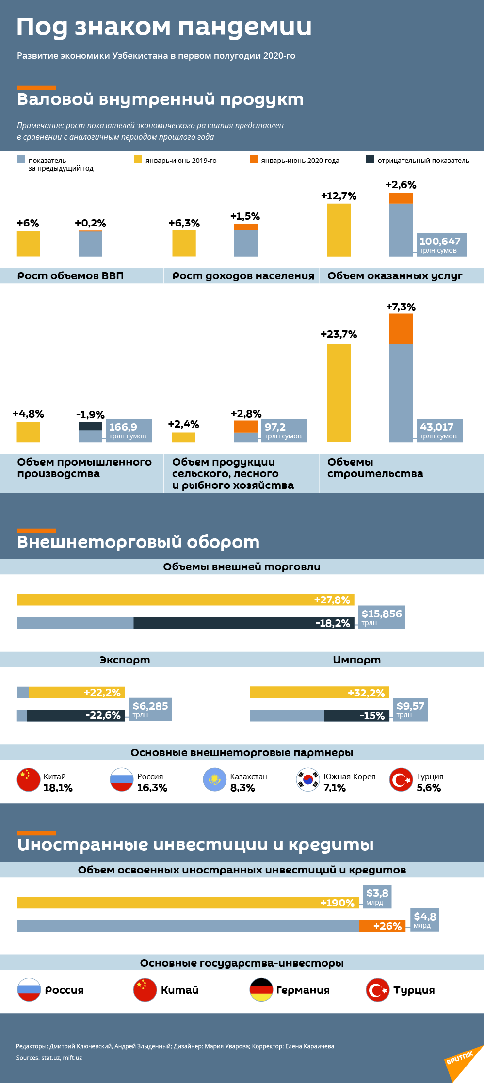 Пандемия коронавируса оказывает влияние на экономику всех стран, в том числе Узбекистана. С какими результатами республика завершила полугодие, смотрите в нашей инфографике.