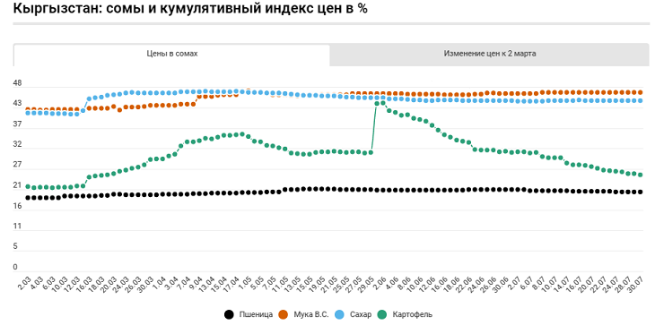 Во второй половине июля не наблюдалось значительных изменений в ценах на пшеницу, муку и сахар в Кыргызстане и Таджикистане. Цены на картофель продолжает снижается в Кыргызстане и Таджикистане, что отражает сезонный тренд снижения цен на овощи. Так, кумулятивный индекс цен в % на все овощные продукты в Казахстане снизился.