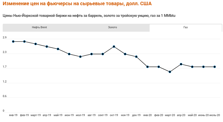 Мировые цены на нефть продолжают расти. По состоянию на 31 июля, цена на нефть составила 43.5 долларов США за баррель. Цены фьючерсов на золото также продолжают расти и на конец июля составили рекордные 1994 долларов США за унцию, а цены на газ стабилизовались на 1.8 долларов США за 1 MMbtu."
