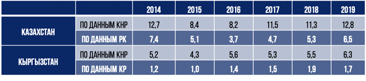 Объемы импорта товаров из Китая в Казахстан и Кыргызстан в 2014-2019 гг., в млрд. долларов (по данным)