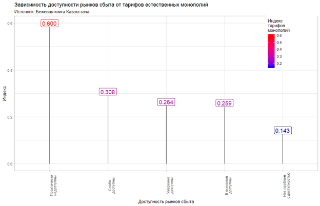 На рисунке 1 мы видим хорошо выраженную зависимость доступности рынков сбыта от тарифов естественных монополий. Чем сильнее отрицательное влияние тарифов, тем хуже с доступностью к рынкам сбыта.