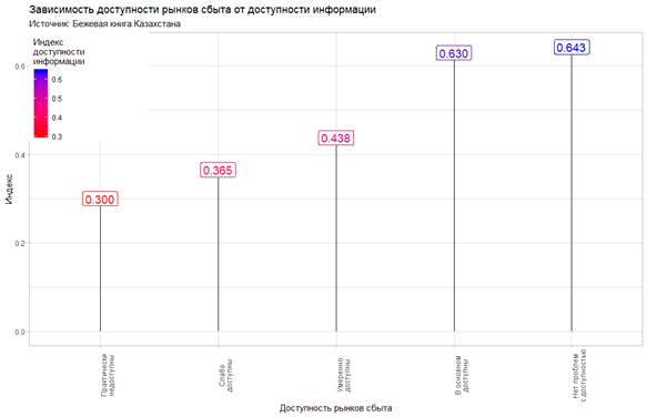 У нас этой проблемой практически никто не озабочен. Первая беда, порождаемая этой асимметрией, - она затрудняет выход на рынок новых игроков. В условиях дефицита информации (побочный эффект асимметрии) ошибочных решений принимается больше, чем в условиях достаточной информации. Вторая беда – транзакционные издержки выше у тех, кто испытывает дефицит информации, чем у тех, у кого информации достаточно. Результаты Бежевой книги показывают связь между доступностью рынков сбыта и доступностью информации (смотрите рисунок 2) - чем более доступна информация, тем более доступны рынки сбыта.