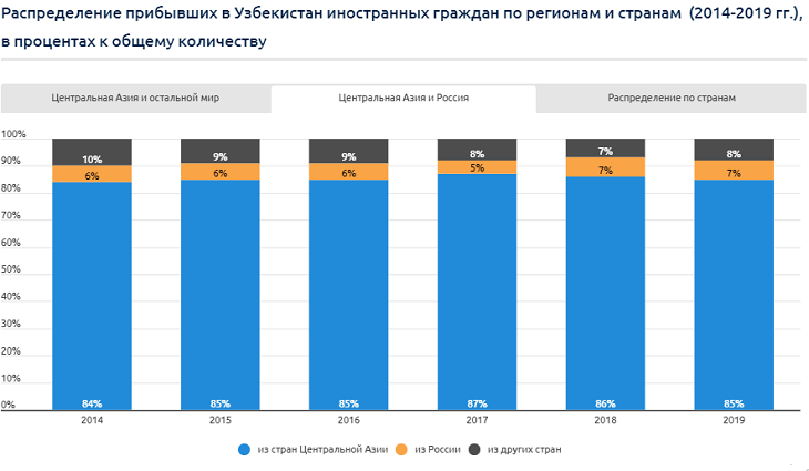 Несмотря на рост количества иностранцев из дальнего зарубежья (кроме стран постсоветских республик), такими же темпами выросло число въезжавших в Узбекистан из стран Центральной Азии. Страны Центральной Азии и Россия вместе обеспечивают 90-93% потока иностранных посетителей в Узбекистан. Основной поток иностранных посетителей обеспечивается за счет граждан соседних стран, часть которых приезжают в страну, возможно, и с деловыми целями, прикрываясь туризмом.