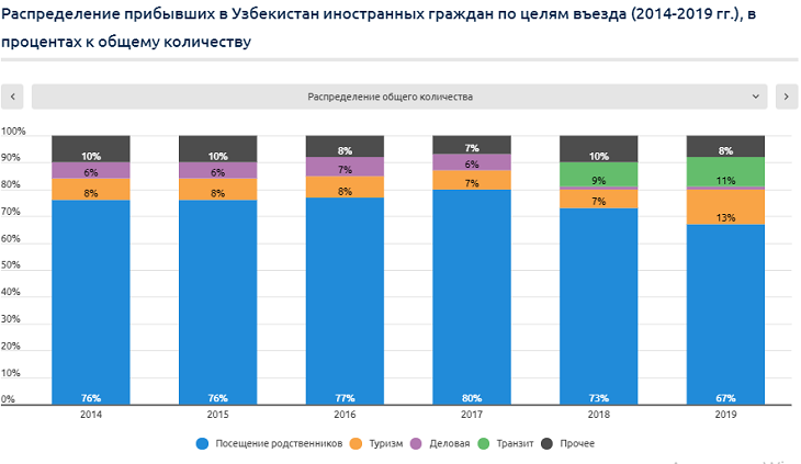 Но проблемы с гостями из соседних стран в том, что они предпочитают не тратить много денег (что указывает на нетуристическую природу их визитов). В общем потоке въехавших иностранных граждан в Узбекистан преобладает доля тех, кто прибывает с целью «посещение родственников». Несмотря на снижение этой доли с 77-80% до 67% за последние 3 года, все же она остается весомой. Хотя в большинстве своем эта категория прибывающих не пользуется услугами гостиниц (размещаются у родственников, проживающих в Узбекистане) или в меньшей степени пользуется ими, тем не менее, зачастую они посещают мусульманские святыни, главные туристические города – Самарканд, Бухару и Хиву, создают дополнительный спрос на услуги транспорта, общепита и торговой сферы.