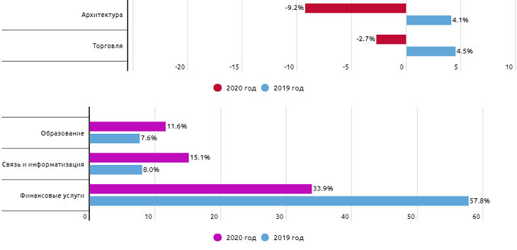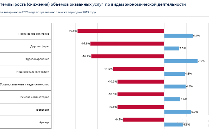 Рекордсменом по снижению объема оказанных услуг по видам экономической деятельности стала сфера услуг по проживанию и питанию. Значительное снижение наблюдается также в смежных сферах: транспорт, индивидуальные услуги и торговля. Среди указанных ниже 13 видов деятельности рост был отмечен только в 3 сферах: финансовые услуги, информатизация и образование.