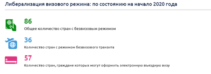 На начало 2017 года список стран, для которых был установлен режим безвизового въезда в Узбекистан, включал в себя не более десятка стран. Спустя 3 года, этот список был расширен почти в десять раз, введен режим безвизового транзита – позволяющий иностранцам пребывание в стране до 5 суток, упрощена процедура учета и временной регистрации иностранных граждан, введен порядок оформления электронных виз, введены специальные категории виз: