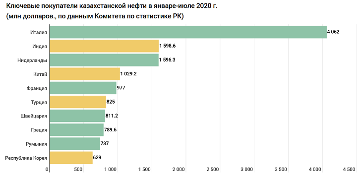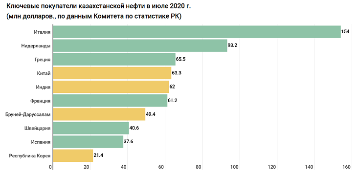 По сравнению с июнем экспорт нефти сократился на $532,6 млн. Из 15 стран, которые были основными покупателями казахстанской нефти в первый летний месяц, объемы сделок упали с 14. При этом в 11 случаях сократился и физический объем поставок. Наиболее сильное снижение отмечается по странам, которые являются крупнейшими покупателями: