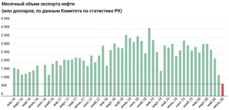 Июль 2020 года стал крайне неудачным месяцем для казахстанских экспортеров нефти. С одной стороны физический объем поставок остался на привычном уровне. За месяц было реализовано 6,2 млн тонн, что соответствует средним объемам первого полугодия. Однако валюты за проданную сырую нефть выручили гораздо меньше, чем обычно. Всего $724,1 млн.