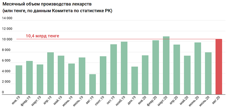Показатели августа 2020 года стали за это время одними из лучших. Лекарств за месяц было произведено на 10,4 млрд тенге. Больше было только в марте – более 10,9 млрд. Всего за 8 месяцев в республике их было выпущено на 73,5 млрд – на 49,4% больше показателей за аналогичный период 2019 года.