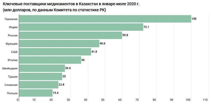 Казахстан закупает медикаменты в 55 странах мира, включая и достаточно экзотические (вроде Сан-Марино и Южной Африки). Но почти половину всего импорта обеспечивают всего пять государств:
