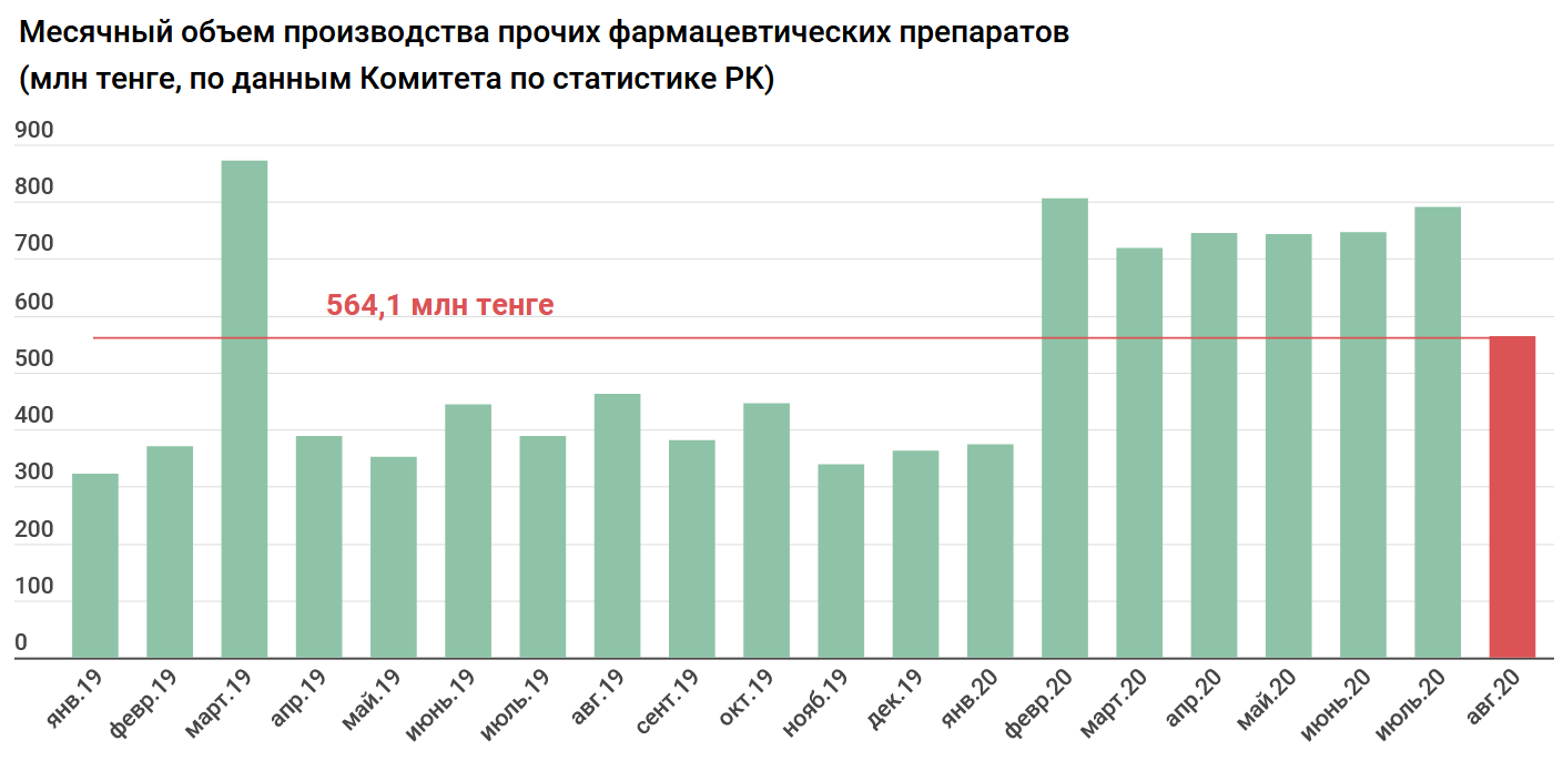Таким образом, общий объем производства лекарств и прочих фармацевтических препаратов за 8 месяцев 2020 года составил 78,9 млрд тенге (в 2019 — 53,6 млрд). Рост — 47,4%. Однако важно помнить, что измеряется он в стоимости произведенной продукции.