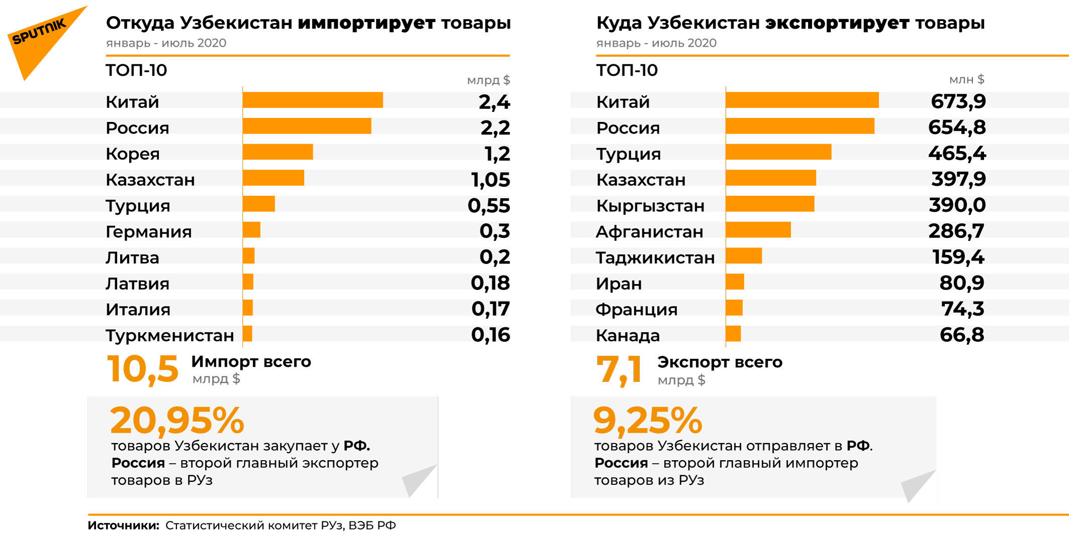 Россия в целом играет важную роль в системе внешнеторгового оборота РУз. С января по июль текущего года Узбекистан импортировал российские товары на 2,2 млрд долларов, что составляет почти 21% импорта. По данному показателю Россия уступает лишь Китаю, за 7 месяцев 2020 года продавшего Узбекистану товаров на 2,4 млрд долларов.