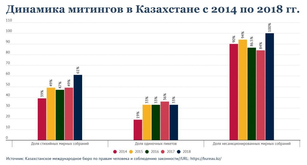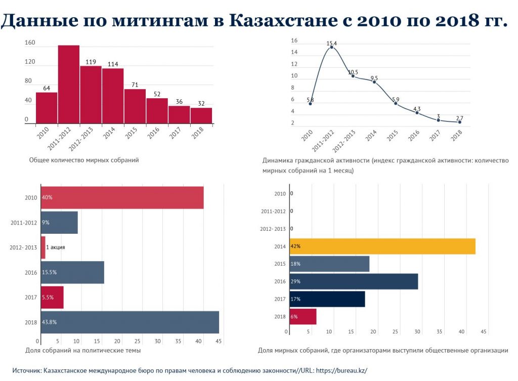 В отсутствие официальных данных по митингам и мирным собраниям будем опираться на данные СМИ и Казахстанского международного бюро по правам человека (КМБПЧ). Мониторинг мирных собраний КМБПЧ за 2010-2018 годы показал, что чаще всего казахстанцы выходят на улицу по социально-экономическим причинам, к которым относятся жилищные вопросы, девальвация, трудовые конфликты, запуск российских «Протонов» (экологический эффект) и т.п.