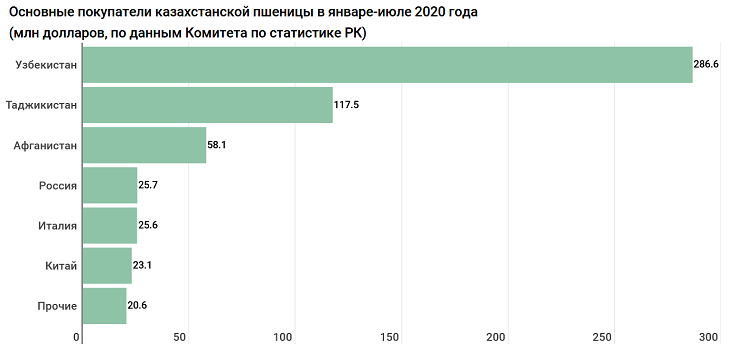 По официальным данным, в январе-июле 2020 года Казахстан продал за рубеж 2,56 млн тонн пшеницы и меслина. По сравнению с аналогичным периодом 2019 года физический объем экспорта упал на 22,4%, или почти 740 тыс. тонн. Сократилась и выручка от продаж – с $612,1 до 557,2 млн.