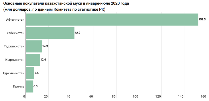 Зато вырос экспорт муки. Физический объем — ненамного, всего на 1,6%, но выручка сразу на 30% — до $236 млн. В первую очередь за счет Афганистана, нарастившего импорт сразу на $40 млн. Сейчас на это направление приходится 65% казахстанского экспорта муки. На втором месте Узбекистан — $42,9 млн.