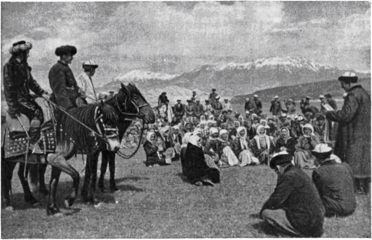 Большим событием в общественной жизни являются устраиваемые по нескольку раз в году на ипподромах городов Фрунзе и Пржевальска, а также в других пунктах конно-спортивные праздники, программы которых обязательно включают наиболее любимые народом национальные игры и состязания. В них обычно входят состязания народных силачей (курвги), борьба на конях (оодарыш), скачки юношей и девушек — «погодя за девушкой» (кыз куумай). Интересно отметить, что на новогоднем празднике в Пржевальске в 1959 г. победу в этой скачке одержала русская наездница — студентка Валя Гребенщикова. Устраивается также состязание по перетягиванию аркана (аркан тартыги). После скачек и заездов племенных скакунов организуются так называемые гладкие юкачки с участием колхозных лошадей — am чабыги или аламан байга на дистанцию до 8—10 км, в которых наездниками бывают обычно юные джигиты, в возрасте 10—12 лет. Иногда устраивают гладкие скачки с жо- кеями-девушками. Демонстрируют свою ловкость джигиты и в состязании тыйын эн^мей, во время которого нужно на всем скаку поднять с земли монету. Наконец, в заключение обычно устраиваются проходящие с большим спортивным азартом конские скачки с козлом (улак тартыги). На этих праздниках всегда присутствуют многие тысячи зрителей, остро реагирующих на все перипетии состязаний и игр.