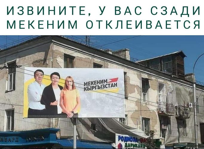 Как известно, партия «Мекеним Кыргызстан» презентовала свою программу под призывом «Да!» («Ооба»). Практически по всей стране развешаны агитационные материалы с этим лозунгом. В интернете не смогли обойти стороной и посмеяться над ними и другими баннерами партии.