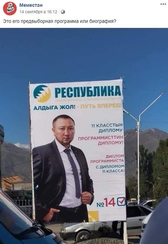 Пользователи Facebook выложили в Сеть фотографию баннера партии «Республика». На фото изображен мужчина. Подписи рядом на кыргызском и русском языках гласят «Диплом программиста с дипломом 11-го класса».