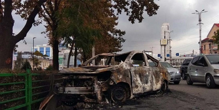 В центре города остались сожженные накануне машины, в том числе и патрульные.